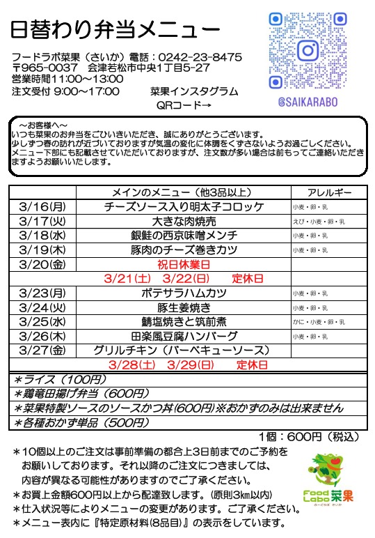 2026.3.11 菜果メニュー更新しました!!