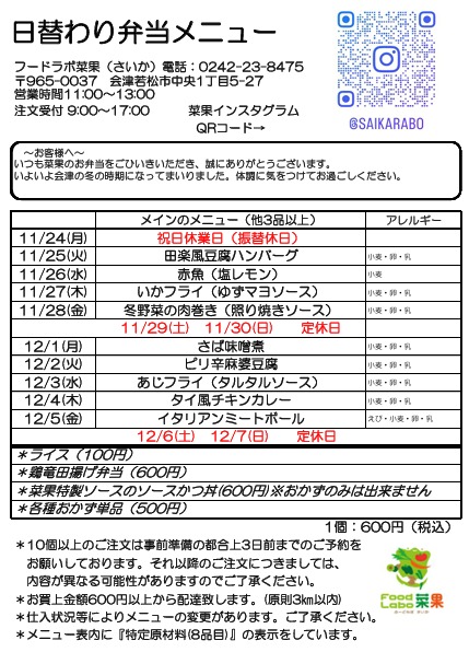 2025.11.17 菜果メニュー更新しました! いつも菜果のお弁当を食べていただき、誠にありがとうございます! いよいよ会津の冬の時期になってまいりました。体調に気をつけてお過ごしください。 お弁当のご注文は下記の電話番号から承ります!是非ご利用ください!