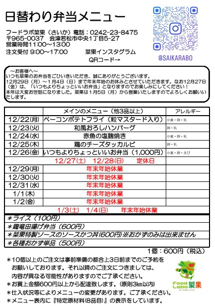 12月29日(月)~1月4日(日)まで年末年始のお休みとさせていただきます。なお12月27日(金)は、「いつもよりちょっといいお弁当」となりますのでお楽しみにしてください!