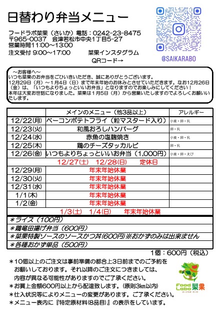 12月29日(月)~1月4日(日)まで年末年始のお休みとさせていただきます。なお12月26日(金)は、「いつもよりちょっといいお弁当」となりますのでお楽しみにしてください!